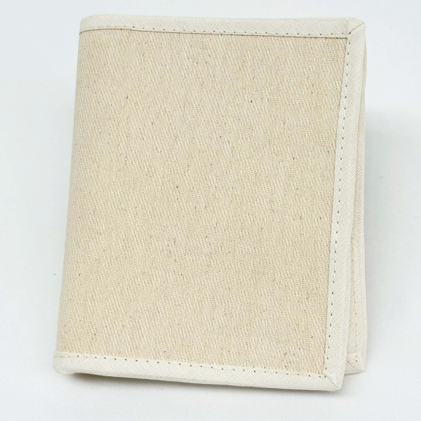 Porta pasaporte confeccionado en lona brin pesada, con terminación en bies de poplín.