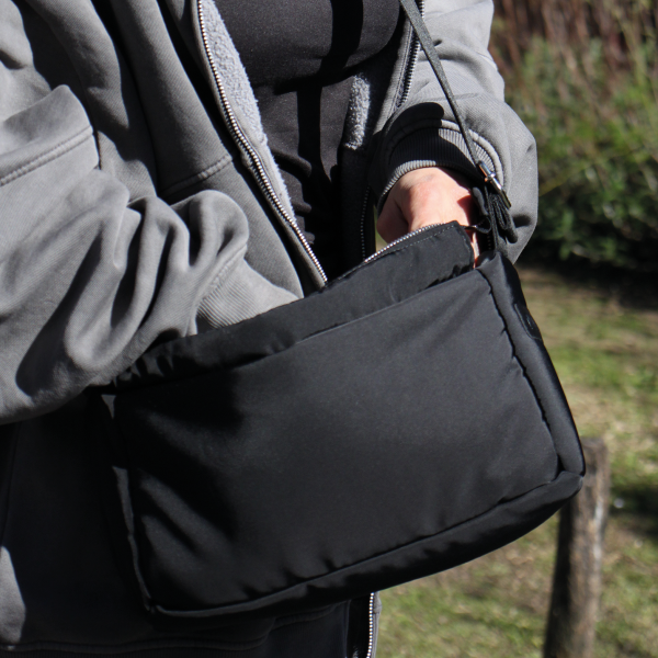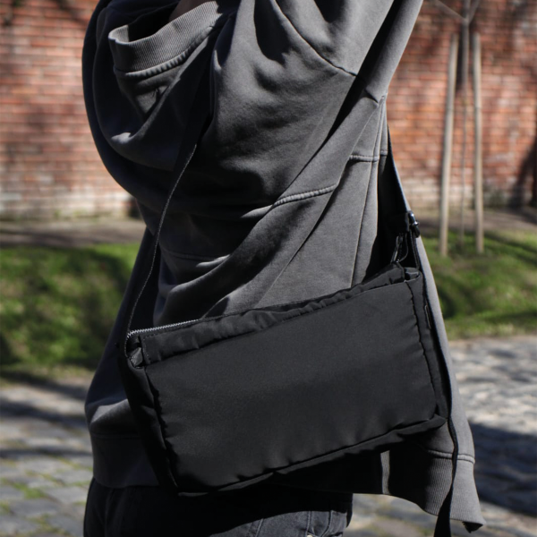 Baguette bag confeccionada en andorra textil forrada, con regulador metálico que permite usarla como bandolera o corta a la axila. Cierre metálico YKK.