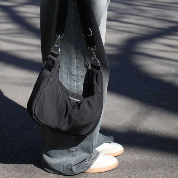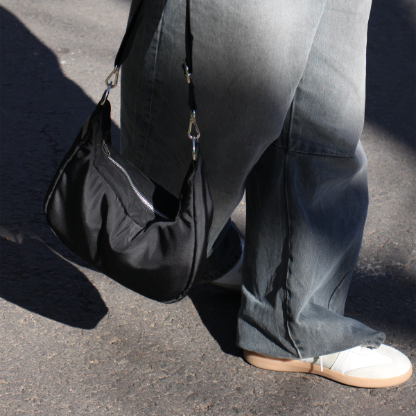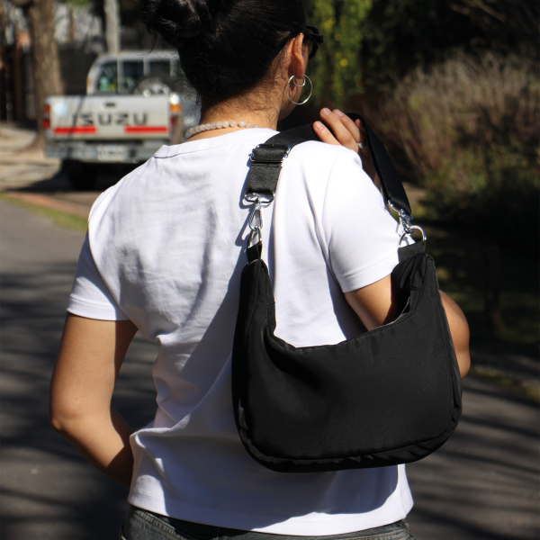 Cat bag confeccionada en andorra textil forrada, con tira regulable metálica que permite usarla como bandolera o corta a la axila.